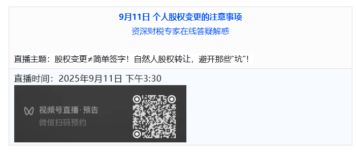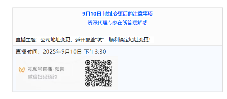 二場直播分別著力解決您的工商地址變更,自然人股東股權(quán)轉(zhuǎn)讓的關(guān)鍵問題。歡迎您的收看。